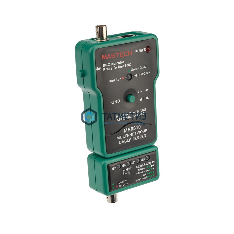 Тестер с генератором сигнала MASTECH MS6810 13-1222 применяется для проверки коаксиальных кабелей (BNC), неэкранированных кабелей «витая пара» (UTP), экранированных кабелей «витая пара» (STP). Позволяет определить наличие обрывов и короткого замыкания.